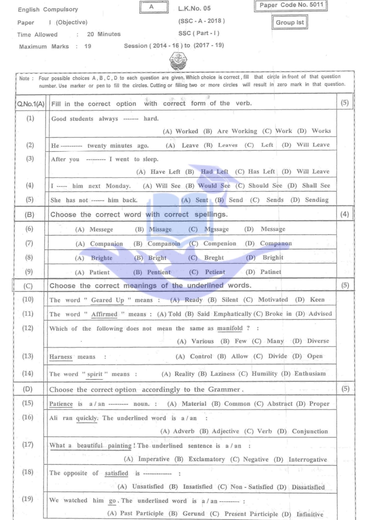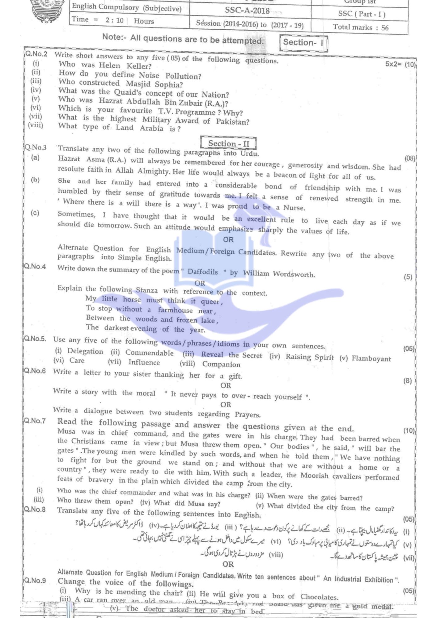 Bahawalpur Board 9th class English Past Papers 2018 Group I OBJECTIVE PARTDownload SUBJECTIVE PARTDownload
