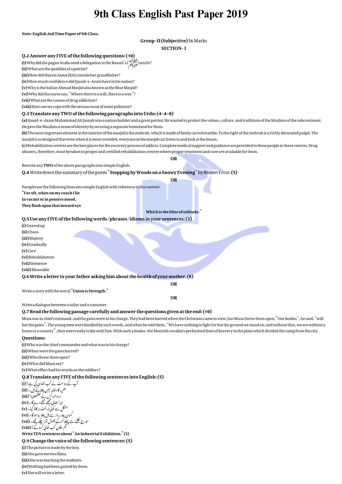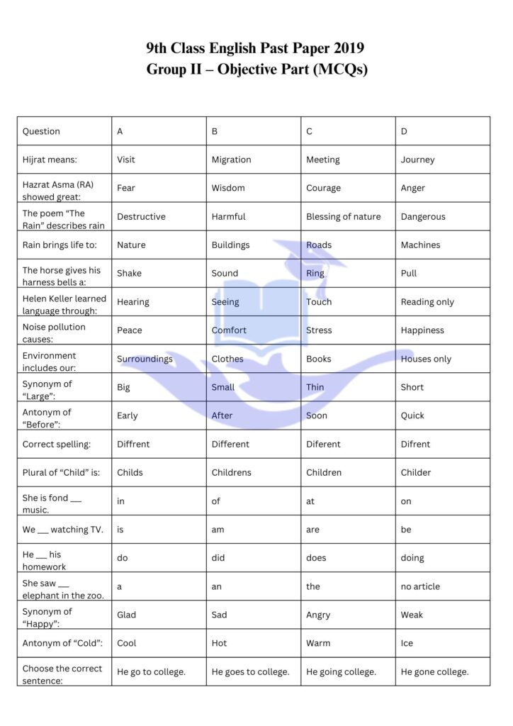 Bahawalpur Board 9th class English Past Papers 2019 Group II OBJECTIVE PARTDownload SUBJECTIVE PARTDownload