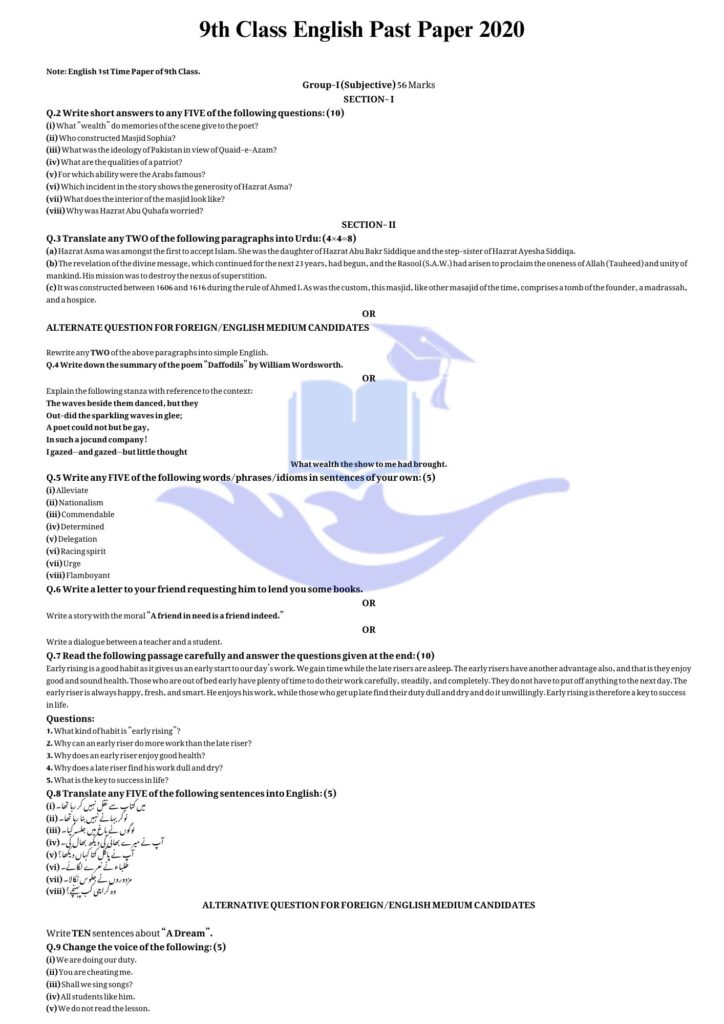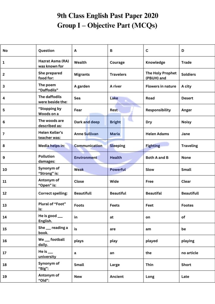 Bahawalpur Board 9th class English Past Papers 2020 Group I OBJECTIVE PARTDownload SUBJECTIVE PARTDownload