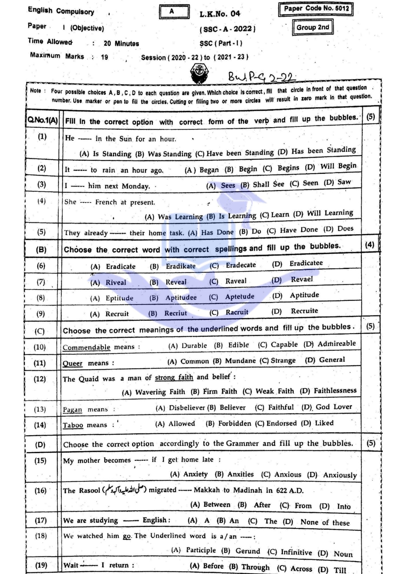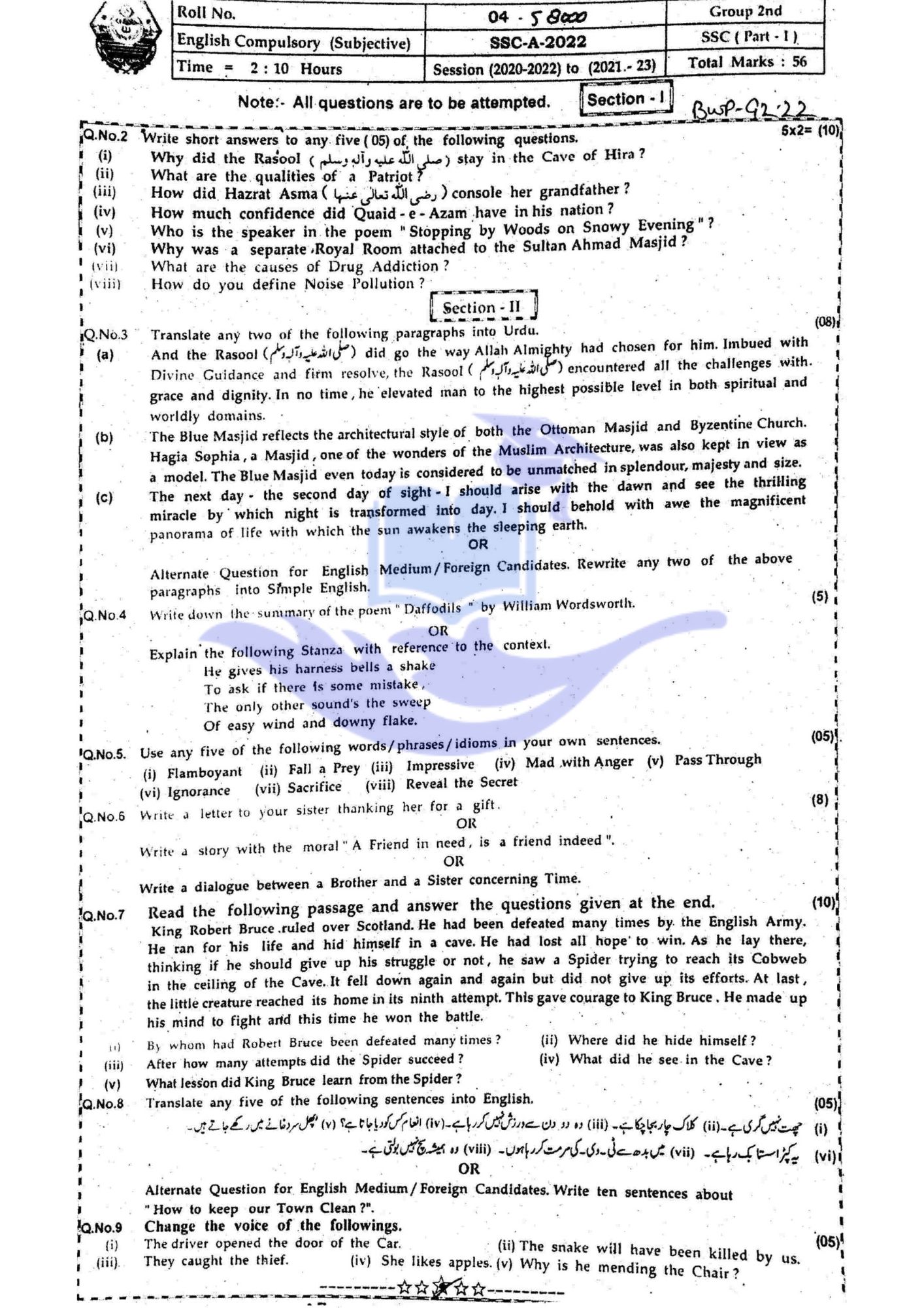 Bahawalpur Board 9th class English Past Papers 2022 Group II OBJECTIVE PARTDownload SUBJECTIVE PARTDownload